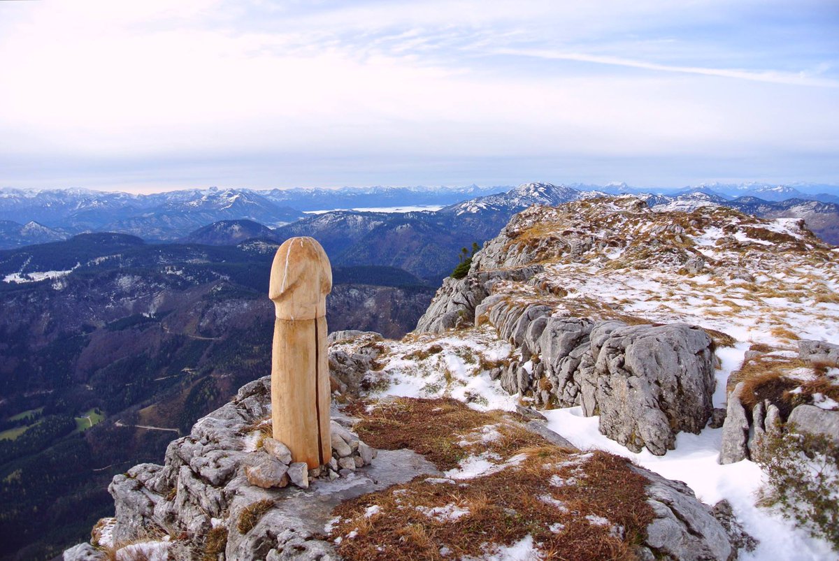 Una llamativa escultura sorprendió el jueves pasado a la montañista y bloguera Marika Roth, en la cumbre de la montaña Ötscher, en los Alpes austríacos: se trata de una figura de manera con forma de pene gigante.