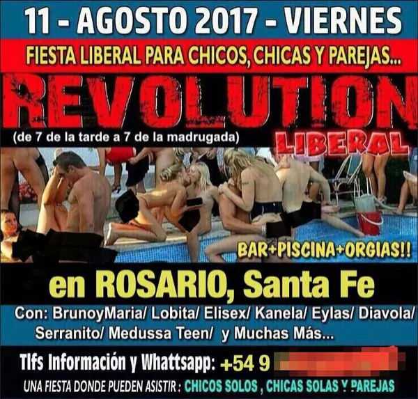 El flyer invitaba a formar parte de una celebración liberal en la que se prometían orgías, sexo, una pileta y mucho alcohol. Debajo del aviso, se publicaba un número de teléfono al que llamar para hacer las reservas.