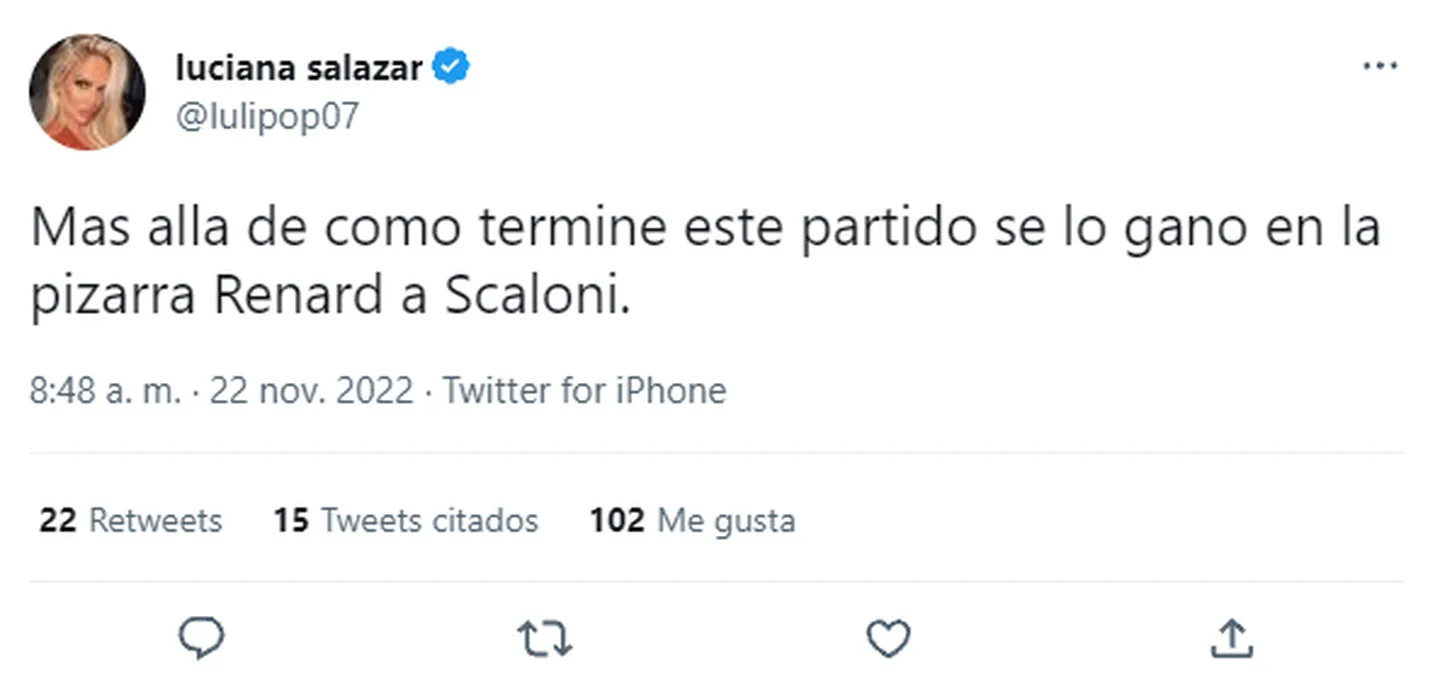La Selección Argentina perdió 2 a 1 contra Arabia Saudita en el inicio del Mundial Qatar 2022 y las redes estallaron. Luciana Salazar no fue la excepción y minutos antes de que finalice el encuentro, analizó el resultado y responsabilizó al técnico del equipo.