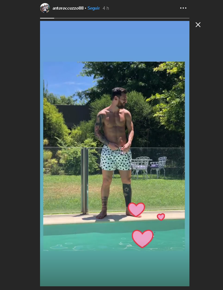 En ese contexto, su esposa Antonela Roccuzzo compartió una foto de la "Pulga" en traje de baño en la que expone su buen estado físico. Acompañado de unos emojis de corazones, la madre de los tres hijos de la pareja subió la imagen a las stories de su cuenta en Instagram.