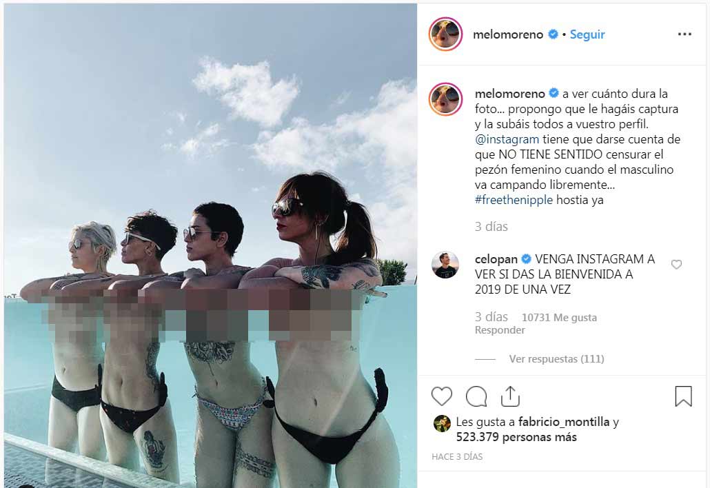 En la imagen aparece Moreno, su novia y dos instagramers enseñando libremente sus pechos en una piscina. "A ver cuánto dura la foto. Propongo que le hagan captura y que la suban todos a sus perfiles. Instagram tiene que darse cuenta de que no tiene sentido censurar el pezón femenino cuando el masculino va campando libremente", expresó la influencer.