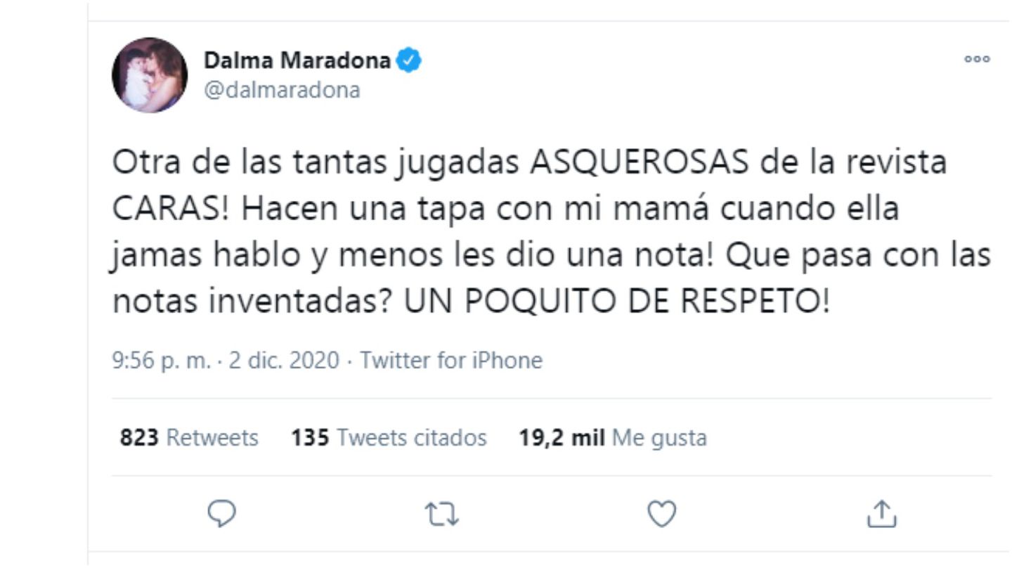 En su cuenta de Twitter, la hija del ‘Diez’ escribió: “¡Otra de las tantas jugadas asquerosas de la revista Caras! ¡Hacen una tapa con mi mamá cuando ella jamás habló y menos les dio una nota!”.