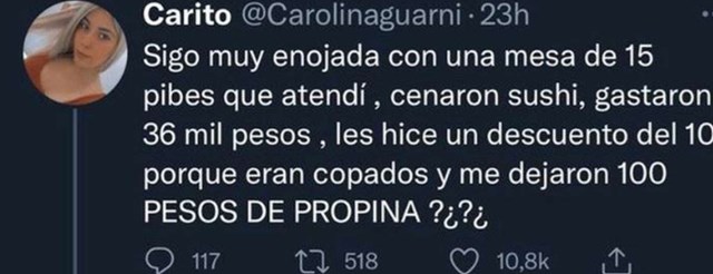 “Sigo muy enojada con una mesa de 15 pibes que atendí. Cenaron sushi, gastaron 36 mil pesos, les hice un descuento del 10% porque eran copados y me dejaron $100 de propina", escribió Carolina Guarnieri.
