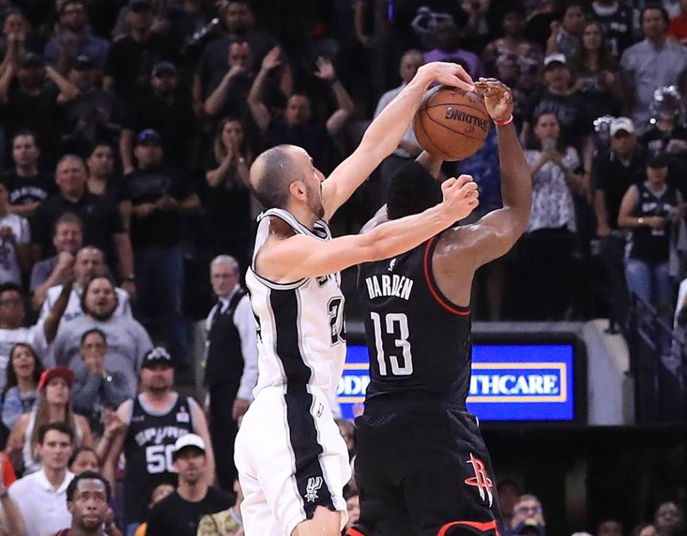 San Antonio ganaba por tres y la última chance de Houston estaba en las manos de James Harden, uno de los grandes candidatos a MVP en la temporada. El de barba buscaba el triple agónico para enviar al duelo a un segundo suplementario, pero apareció él, Manu Ginóbili, para meterle la tapa. Interminable.