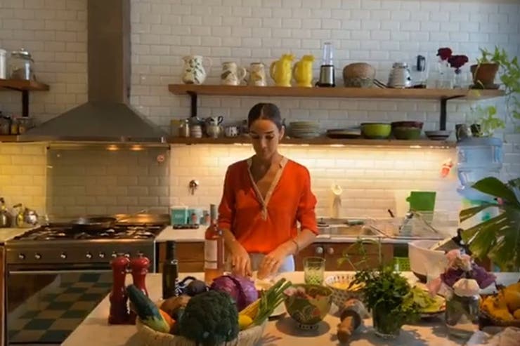 La cocina es muy amplia, aunque sencilla, con azulejos subway, piso damero turquesa, una gran isla central y estantes flotantes de madera con objetos de cocina a la vista. Tiene una cocina de 6 hornallas y doble horno.