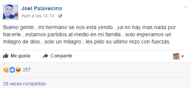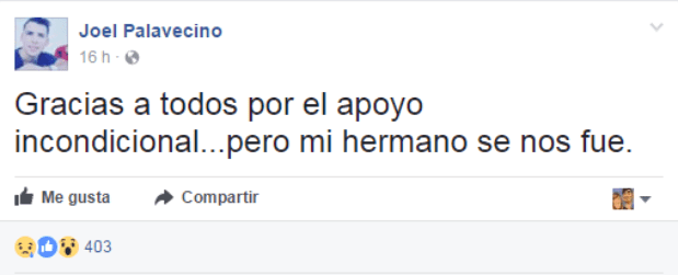 La noticia la dio a conocer su hermano, Joel Palavecino, a través de las redes sociales. “Gracias a todos por el apoyo incondicional… pero mi hermano se nos fue”, escribió. El joven de 16 años había sido encontrado por su mamá en su vivienda de la localidad de El Palenque. Según los investigadores, todo se debió a un “intento de suicidio” basado en la Ballena Azul.