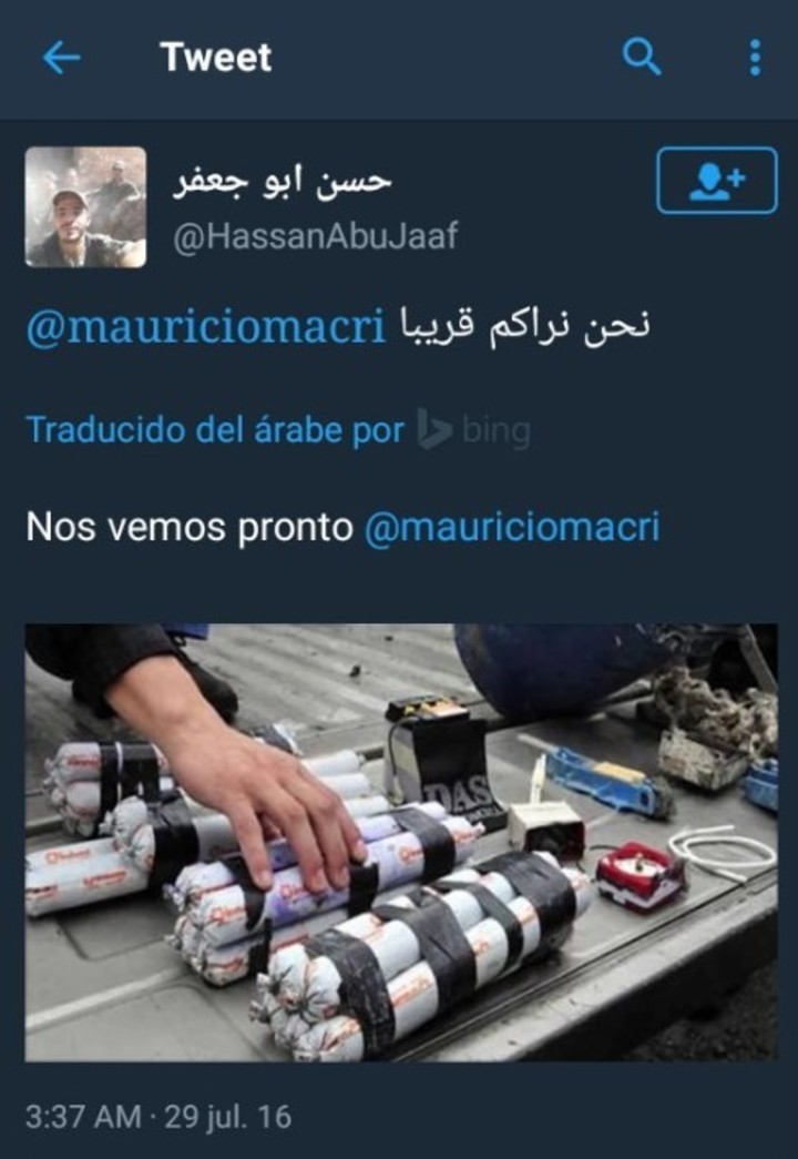 Los que prendieron alertas nacionales fueron uno que interpelaba a Macri con el mensaje "Nos vemos pronto" y la imagen de unos explosivos más otro con la foto de la Casa Rosada junto a la leyenda "Hemos encontrado uno de los objetivos deseados por el islam".