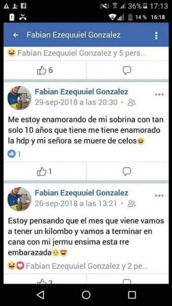 “Me estoy enamorando de mi sobrina con tan solo 10 años que me tiene enamorado la hdp y mi señora se muere de celos”, fue uno de los comentarios que realizó este hombre en su cuenta de Facebook, y se dio a conocer en las redes sociales.