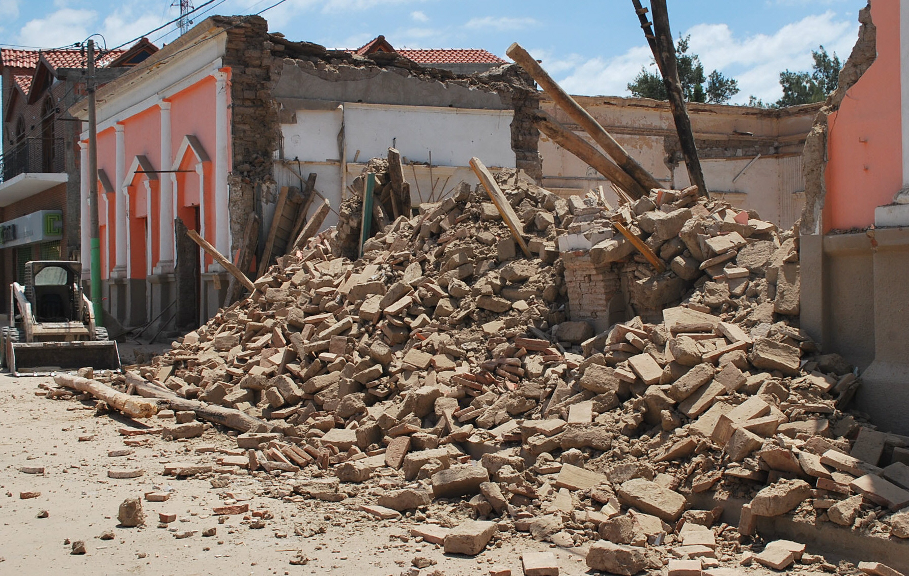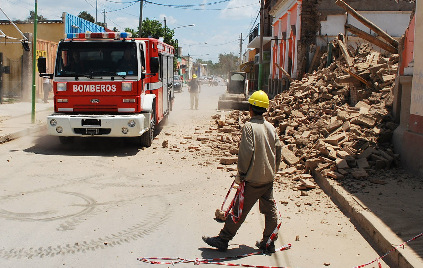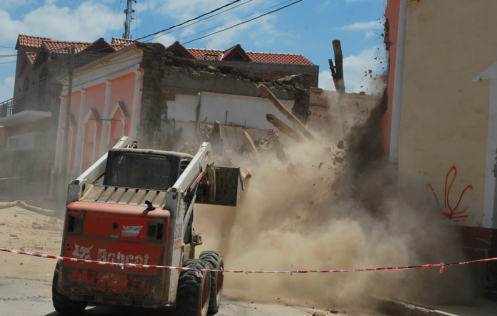 Cerca de las 11, una máquina y un operario con un enorme palo de los que se usan como tirante para los techos, llegaron al lugar para comenzar la tarea. Pero antes de esto, se apostó la gente de Protección Civil y Bomberos. Esto, porque se trataba de una construcción que casi ocupaba toda la cuadra. Sólo en el frente, el caserón tenía cuatro habitaciones. Cortaron las calles para evitar accidentes y se procedió a derrumbar las paredes del exterior ya que la parte de adentro ya había sido demolida con anterioridad. Así, en pocos minutos las imponentes murallas rosadas con terminaciones típicas de las construcciones del siglo XIX, quedaron en el piso. La enorme mole de escombros de adobe ocupó toda la vereda e hizo que los operarios continuaran la tarea para despejar el lugar y volver habilitar el tránsito.