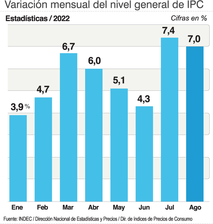 Por encima de todo pronóstico, la inflación de agosto fue de 7%. Si bien significó una desaceleración respecto del mes anterior, el Índice de Precios al Consumidor (IPC) acumuló una suba del 56,4% en los primeros ocho meses del año, informó ayer el Instituto Nacional de Estadística y Censos (Indec).