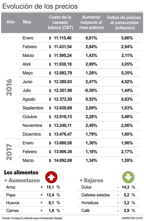 Los precios al consumidor en San Juan tuvieron un repunte en marzo que según la consultora Fundación para el Desarrollo Global (Fundeg) llegó al 1,59% con respecto al mes anterior, quedando por debajo del 2,4% que midió el Indec. Dicho de otro modo, el mes pasado en esta provincia los precios crecieron, pero lo hicieron un tercio menos que a nivel nacional.