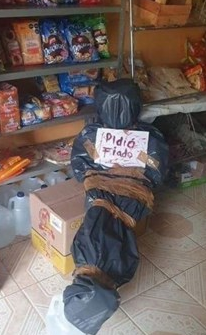 Un comerciante utilizó una insólita estrategia para evitar que sus clientes le pidan mercadería por adelantado: simuló el cadáver de una persona y le colocó un cartel que rezaba "pidió fiado".