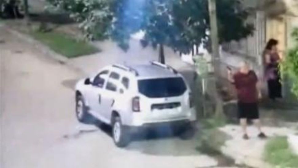 El sujeto comenzó a gritarle a sus vecinos mientras portaba un arma de fuego en cada mano y, de repente, empezó a disparar, mientras su esposa estaba detrás de él, según se puede apreciar en imágenes captadas por las cámaras del municipio.