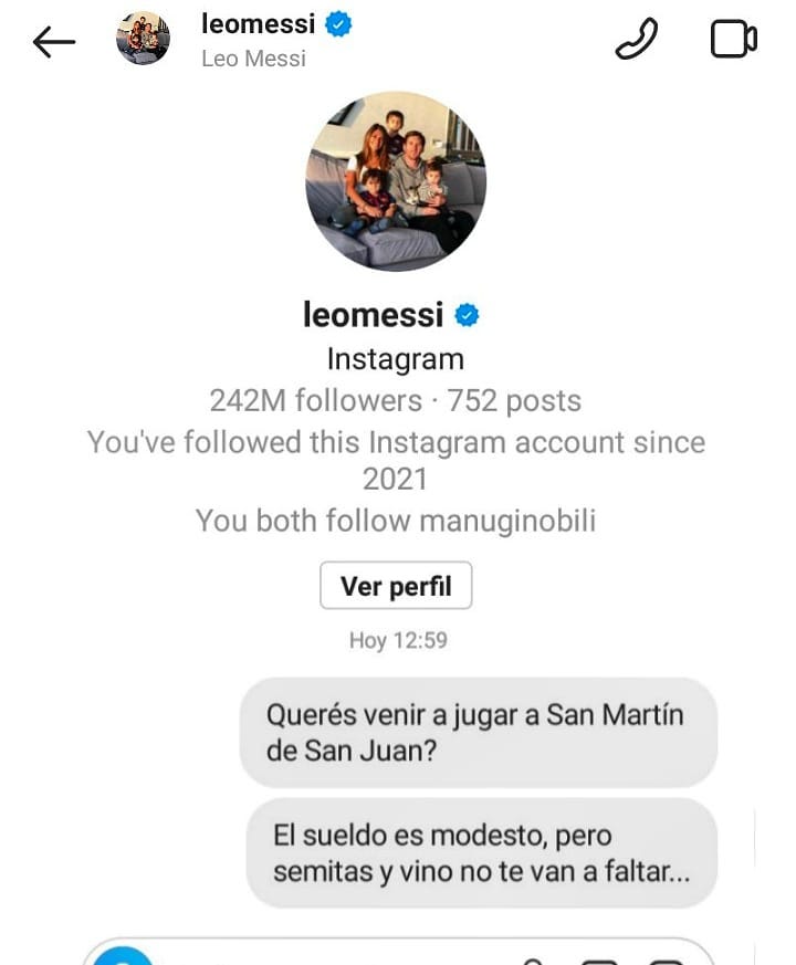 El sanjuanino envió un mensaje privado a la cuenta de Instagram del futbolista pidiéndole tener en cuenta a San Martín. "El sueldo es modesto, pero semitas y vino no te va a faltar", prometió.