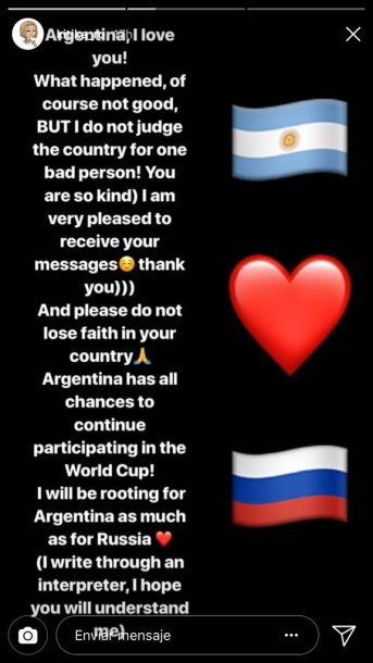 "Argentina! Los amo! Lo que pasó no estuvo bien, PERO no voy a juzgar a su país por sólo una mala persona! Son todos muy amables! Estoy muy contenta de recibir sus mensajes ???? gracias!. Y por favor, no pierdan fe en su país ????. Argentina tiene todas las chances de continuar participando en la Copa Del Mundo!. Seguiré apoyando a Argentina tanto como a Rusia ❤ (Estoy escribiendo a través de un traductor, espero que me puedan entender)", publicó la joven en inglés.