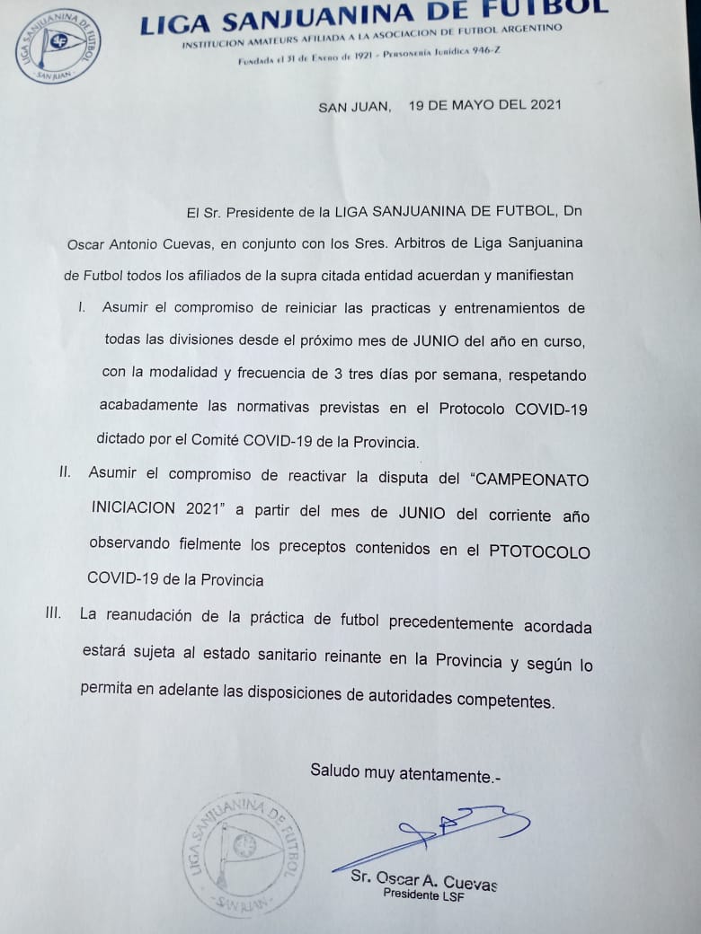 En una nota firmada por el presidente Oscar Cuevas, la entidad detalló que los entrenamientos de todas las categorías de los clubes sanjuaninos volverán el próximo mes (sin fecha precisa) y tendrán una frecuencia de tres días por semanay con el cumplimiento de los protocolos para prevenir contagios de coronavirus.