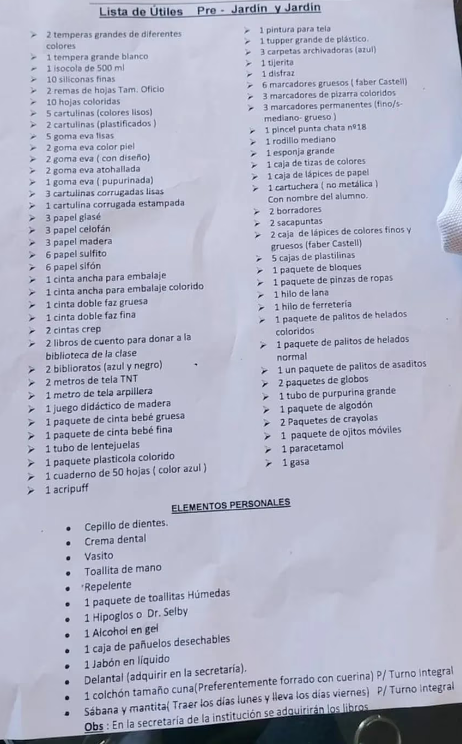 “La que volvió de vacaciones con pocas exigencias es la maestra del jardín”, señaló con ironía en la publicación, que obtuvo más de 48 mil likes, junto a la lista interminable de materiales que deben comprar las familias para sus hijos. Desde “tres carpetas archivadoras” color azul hasta “dos cajas de lápices, de colores finos y gruesos” de una marca premium. Además, entre los útiles personales, apuntaron un “colchón tamaño cuna” y “sábana y mantita”.