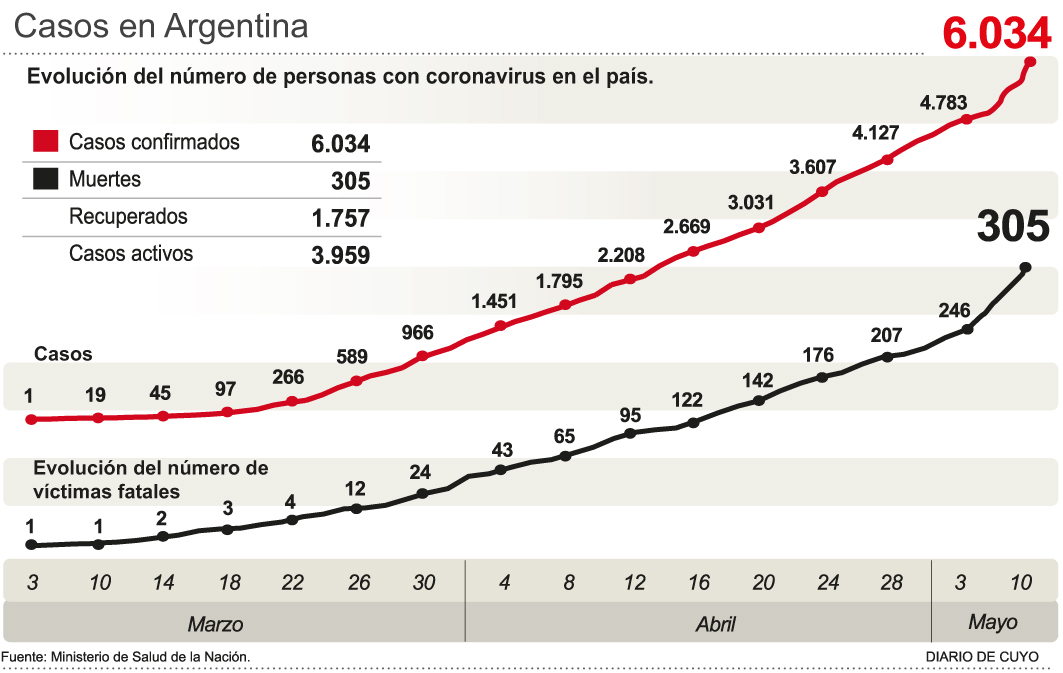 Cinco personas murieron en las últimas 24 horas en Argentina, con lo que ascienden a 305 los fallecidos y a 6.034 los contagiados desde el inicio del brote, informó el Ministerio de Salud de la Nación.