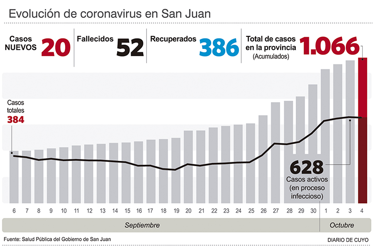 Según los datos oficiales, hay un total acumulado de 52 fallecidos por Covid-10 en la provincia. Estos datos también revelan que el total de casos positivos confirmados es de 1.066, tras los 20 nuevos que se registraron ayer y que muestran un descenso en los últimos tres días y luego del pico de 112 que hubo el jueves pasado. Luego de esta cifra récord comenzó una baja de casos que trajo algo de alivio a las autoridades y a la población. El viernes se registraron 36, el sábado 28 y ayer 20.