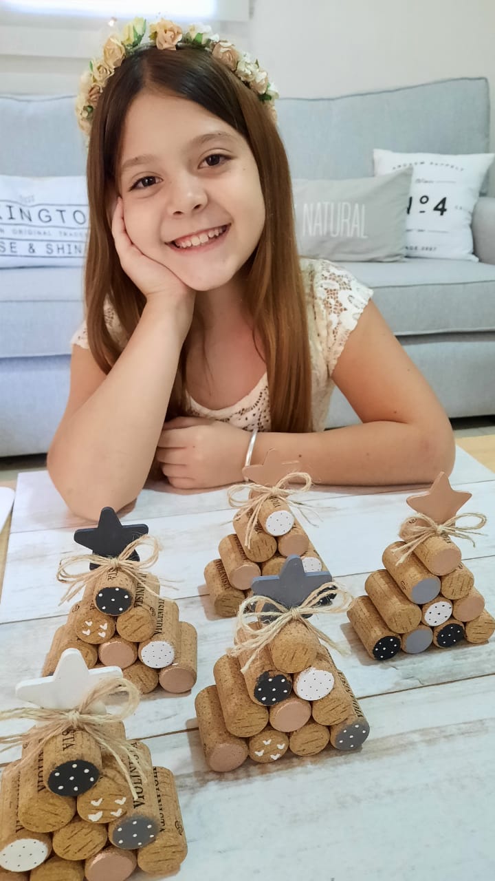 Acomodar los corchos para darle forma de pino, con una base de 4 corchos, encima 3, luego 2 y finalmente 1. Unirlos entre sí, con una gotita de silicona o pegamento. Dibujar una estrella con cartón, recortarla y pintarla con temperas o la pintura elegida. Pintar los corchos a gusto, con los colores de la vajilla, algún dibujo temático o sencillamente pintitas. Dejar algunos con su color natural. Pegar la estrella y terminar con un moño de cinta o cordón para dar un acabado prolijo. Estos arbolitos se pueden distribuir a lo largo de la mesa, al frente de cada plato.