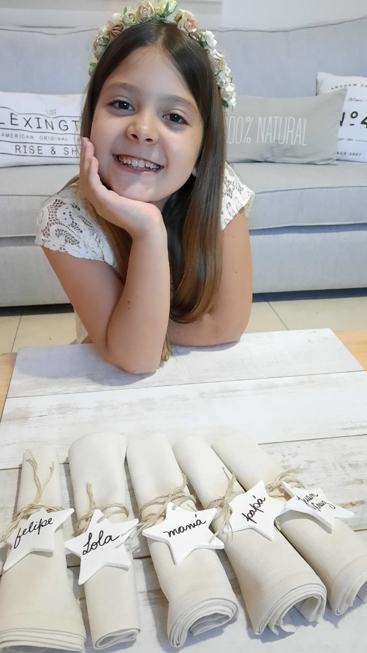 Materiales: Porcelana fría, cortante de estrella o corazón, hilo de yute, servilleta. Estirar la porcelana fría y con un cortante, darle forma. Hacer en el vértice superior de la estrella, un pequeño círculo para pasar un hilo de yute. Escribir con marcador en cada estrella, el nombre de cada comensal o un deseo. Doblar la servilleta. Atar con el hilo de yute y acomodar la estrella de porcelana para que quede a la vista.