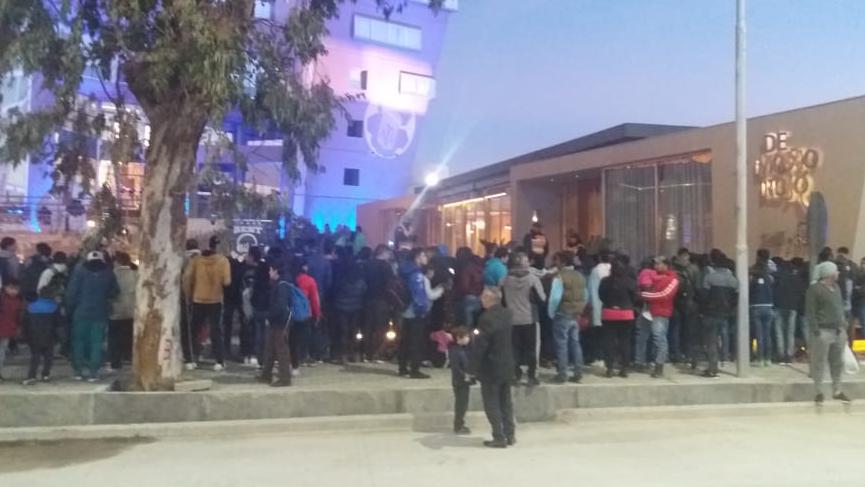 Agolpados en las afueras del hotel.