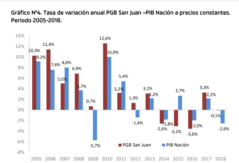 Durante el periodo 2004-2018, la economía de la provincia de San Juan creció un 59% en términos reales acumulados, superando el crecimiento de Nación de 43% en el mismo periodo. En 2004 la participación del PGB-SJ Juan en el PIB Nación era de 1,2%, mientras que en 2018 se incrementó al 1,35%.