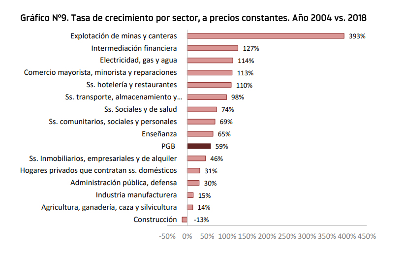 Los sectores con mayor crecimiento son: Explotación de minas y canteras (393%), Intermediación financiera y otros servicios (127%), Electricidad, gas y agua (114%), Comercio (113%), Servicios de hotelería y restaurantes (110%), Servicio de transporte almacenamiento y comunicaciones (98%), Servicios, sociales y de salud (74%), Servicios comunitarios, sociales y personales (69%) y Enseñanza (65%).