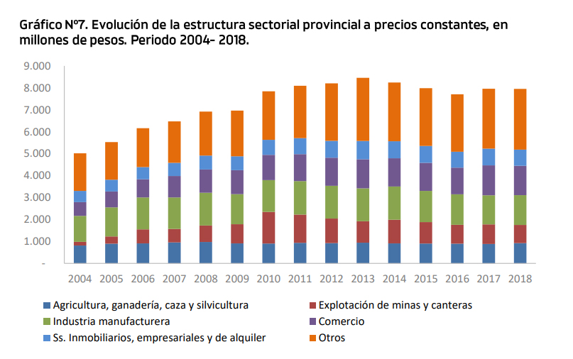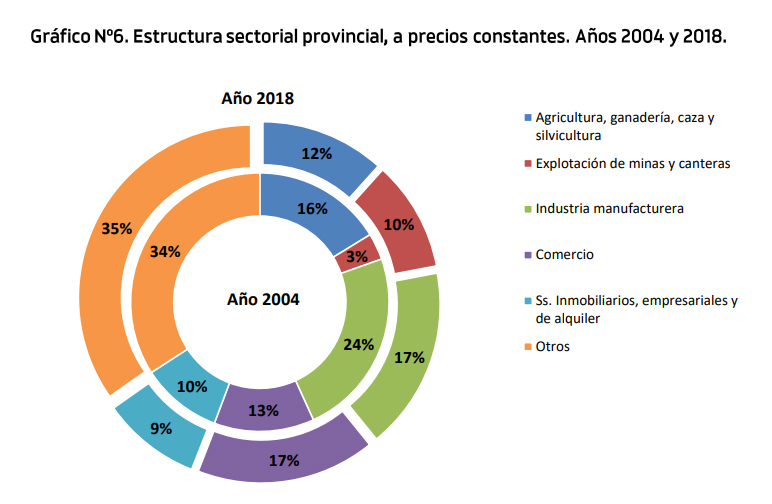 Al analizar la estructura sectorial durante el periodo 2004- 2018, se observa que Explotación de minas y canteras es el que mayor crecimiento presenta, pasando de representar un 3% del PGB provincial en el año 2004 a un 18% en 2010, cuando alcanza su máxima participación. A partir de este año, su contribución decrece hasta alcanzar en 2018 un 10% del PGB. En segundo lugar, el sector Comercio incrementa su participación de 13 % en 2004 a 17% en 2018.Por el contrario, los sectores Industria manufacturera y Agricultura, ganadería y silvicultura disminuyen su contribución de 24% a 17% y de 16% a 12%, respectivamente, en 2018.
