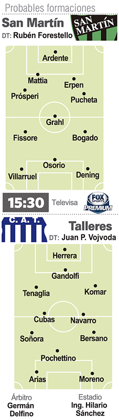 Con Rubén Forestello en el banco de suplentes, el Verdinegro tendrá una formación muy similar a la del cierre de la Superliga. Apenas dos modificaciones por lesiones: salen Federico Milo y Marcos Gelabert, ingresando Facundo Erpen y Francisco Grahl, respectivamente. El dibujo táctico del Yagui será nuevamente el 4-3-3. Justamente el futuro del DT es un tema aún no resuelto para lo que será el regreso a la B Nacional tras la Copa América de Brasil. Desde la dirigencia y el propio DT se encargaron de pensar solamente en esta serie y luego se verá. Además, San Martín transita los pasos previos a una futura votación para renovar o no las autoridades, lo cual es otro ítem a tener muy presente en cualquier decisión trascendental.