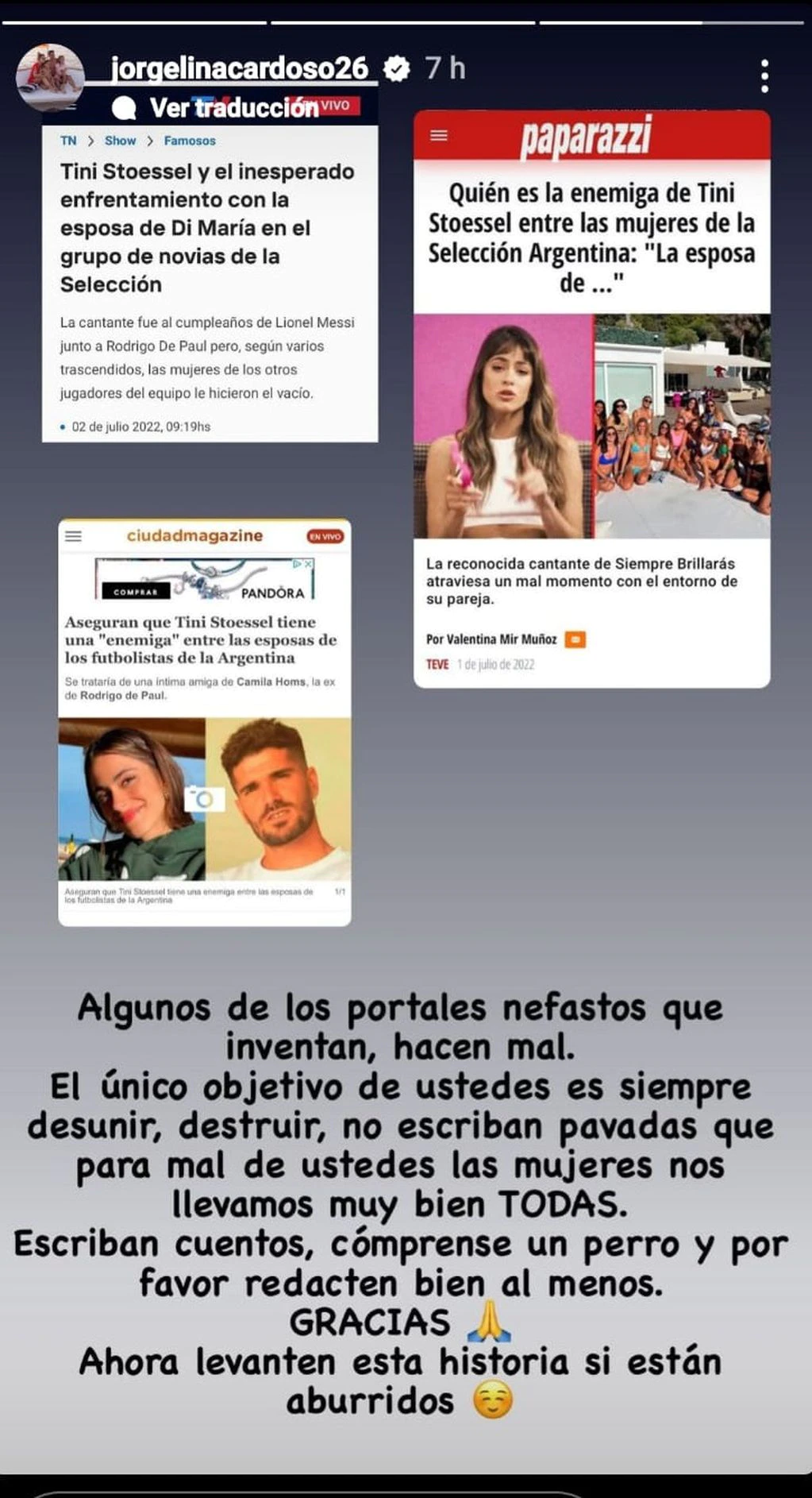 El noviazgo de Tini y Rodrigo De Paul fue un golpe a gran escala. Siempre pasa, en los grupos grandes, que ante la separación de una pareja y la llegada de “la nueva” hay posiciones tomadas y momentos incómodos. Jorgelina Cardoso, la esposa de Ángel Di María, se encargó de “aquietar las aguas” con un furioso posteo en el que asegura que está todo más que bien con la artista.