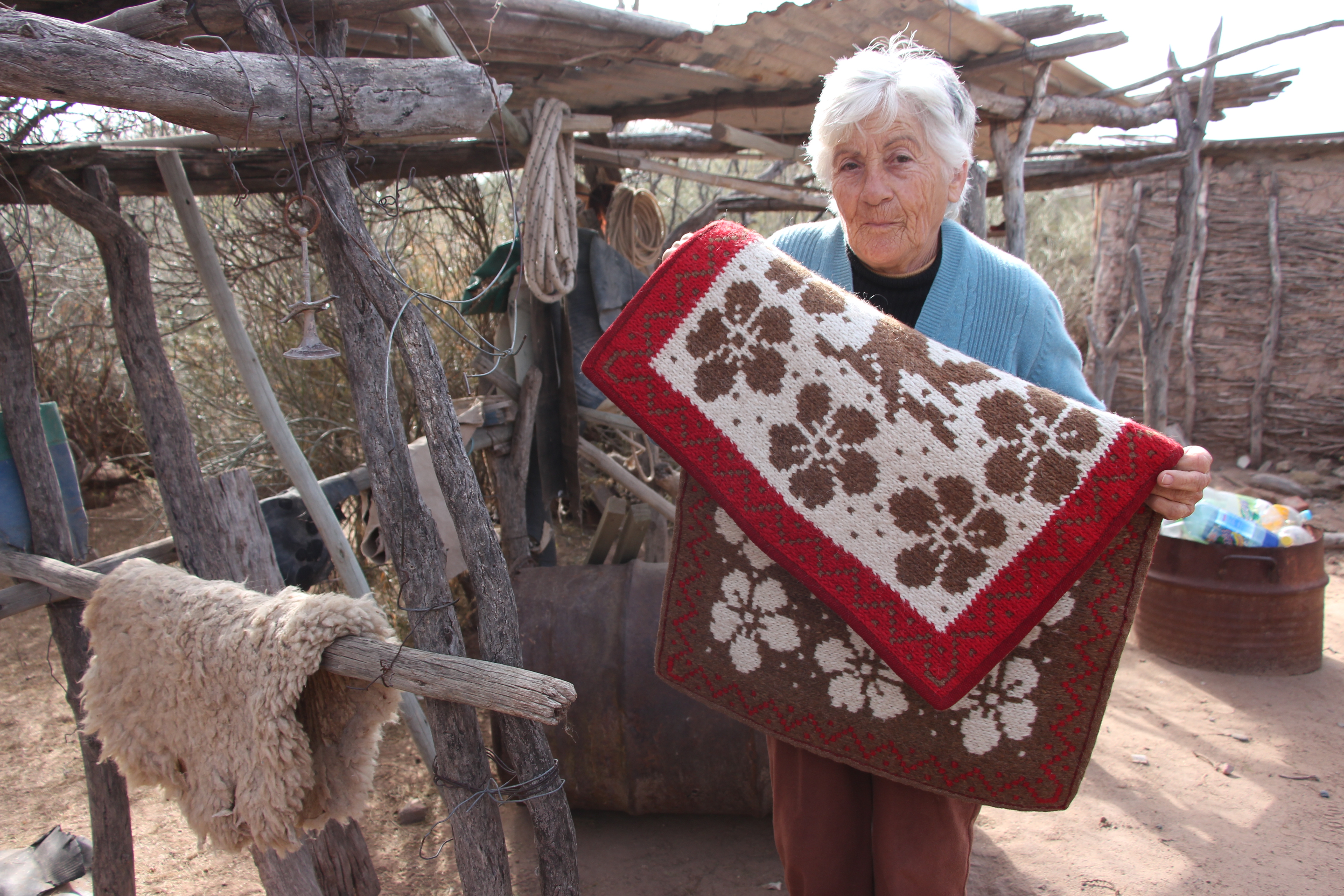 Ganó premios nacionales e internacionales con una técnica especial de tejido que le enseñó su madre. Tiene en las paredes de su casa diversos cuadros como reconocimiento y premios por sus trabajos. Uno de ellos es un diploma del Senado de la Nación. También le regaló, en nombre del pueblo de San Juan, un poncho al expresidente, Néstor Kirchner. Luego de ganar el premio de la Unesco por sus trabajos artesanales que representaron a la Argentina, la Universidad Nacional de San Juan (UNSJ), le edificó una casa para que pudiera vivir de manera digna, allá por el año 2001. Tantos galardones fueron ganados por una mujer que vive sola, en medio del campo, rodeada de médanos, arbustos de distintas clases donde predominan los algarrobos. Y, como si fuera una señal de la vida, nació un 8 de marzo, fecha en que se celebra el ‘Día Internacional de la Mujer”, hace 79 años. Su nombre es Herenia Moyano Reta, una mujer que hace patria en un lugar remoto como inhóspito. Es una mujer ilustre en el departamento. Pero que a la vez, necesita más apoyo, como los demás puesteros de la región. En medio de tantas adversidades que ofrece la naturaleza y el vivir sola, la mujer muestra una gran valentía y confianza en Dios. Para llegar hasta la casa de Herenia hay que salir de la Ruta Nº 20 al puesto de la Bandurria, en la Ruta 20, Km 525, La Chimbera, 25 de Mayo, a unos 20 kilómetros de El Encón. La huella está flanqueada por arbustos de distintas especies y animales silvestres que huyen al escuchar el ruido que provocan los seres humanos con sus vehículos. De ahí andar unos 8 ó 10 kilómetros en medio de médanos que desemboca en su casa.