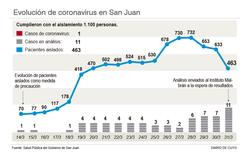 De todos modos es esperable un crecimiento de la curva de casos a partir de los próximos días, por la ampliación para definir los sospechosos y porque desde la semana que viene San Juan hará sus propios tests, tras haber recibido equipamiento para 1.000 muestras.