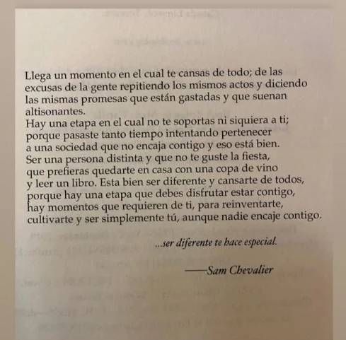 "Ser una persona distinta y que no te guste la fiesta, que prefieras quedarte en casa con una copa de vino y leer un libro. Está bien ser diferentes y cansarte de todos, porque hay una etapa que debés disfrutar estar contigo, hay momentos que requieren de ti, para reinventarte, cultivarte, y ser simplemente tú, aunque nadie encaje contigo… Ser diferente te hace especial", cierra el párrafo.