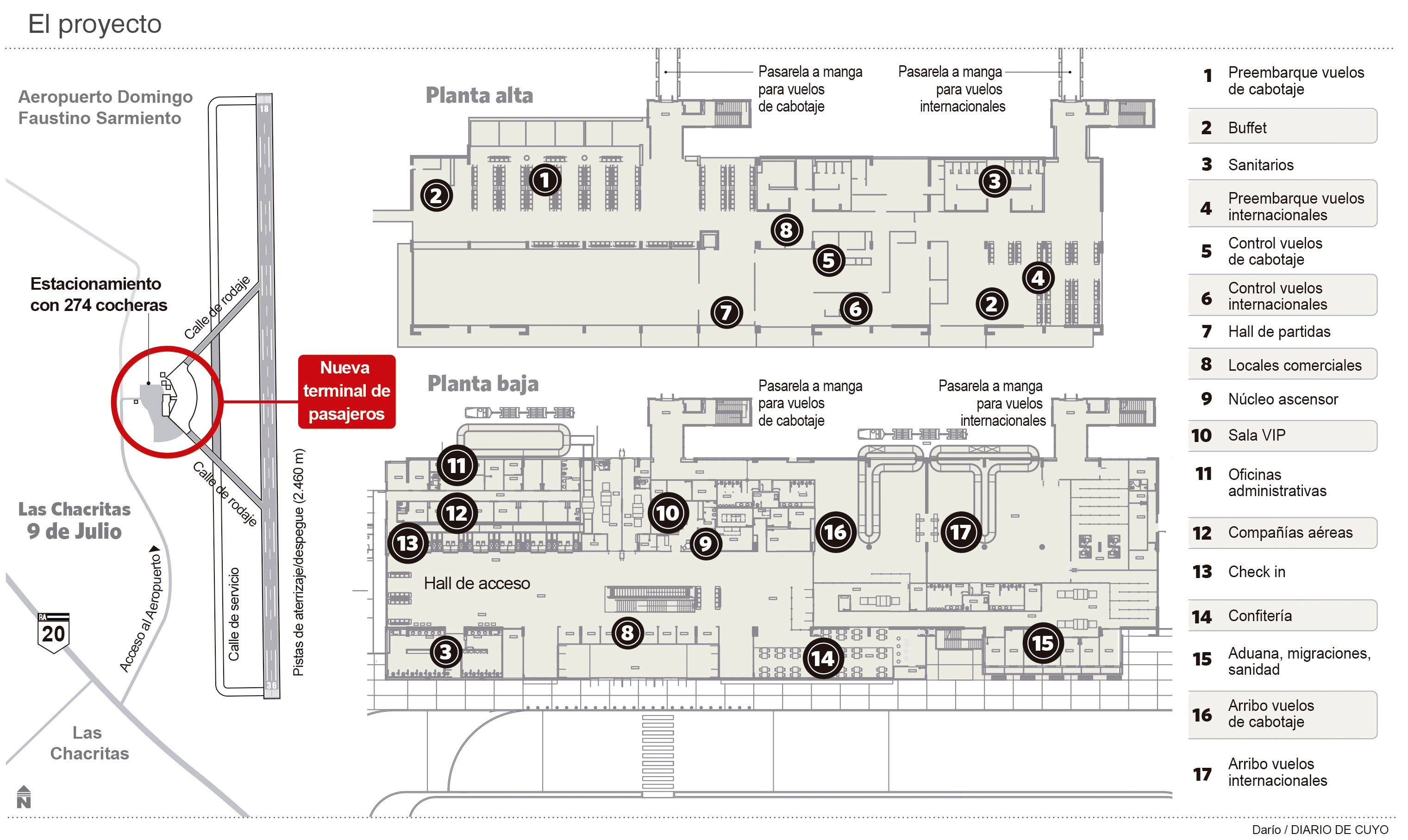También se ubicarán allí las oficinas para líneas aéreas y áreas de control, como Migraciones, PSA, Aduana y Senasa, confitería, locales comerciales y sanitarios.