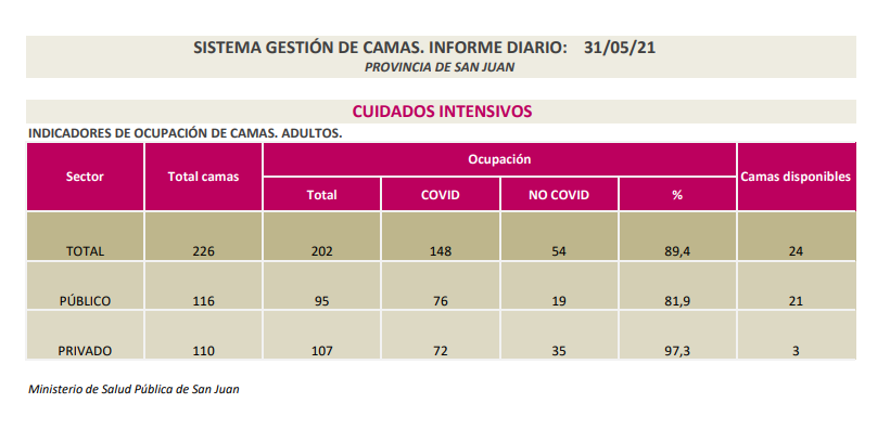 El porcentaje de camas de cuidados intensivos ocupadas en San Juan se mantiene por segundo día consecutivo en 89,4%. En tanto, en el sector privado continúa un número alto con 97,3% y tres camas libres.