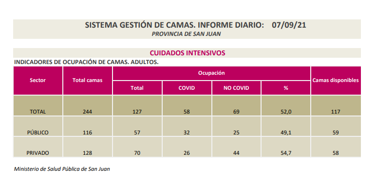 También resaltaron que se encuentran 93 internados pacientes en las áreas de COVID-19 (entre positivos y sospechosos) de los hospitales Dr. Guillermo Rawson; Dr. Marcial Quiroga; Dr. Ventura Lloveras, de Sarmiento; Dr. César Aguilar, de Caucete; Dr. José Giordano, de Albardón; Dr. Federico Cantoni, de Pocito; CEMEC; Dra. Julieta Lanteri; Hospital San Roque, de Jáchal; Hospital Dr. Alejandro Albarracín, de Valle Fértil; Hospital de Barreal, de Calingasta; Hospital Privado; Instituto Médico; Clínica El Castaño; Clínica Santa Clara; Sanatorio San Juan y CCI.