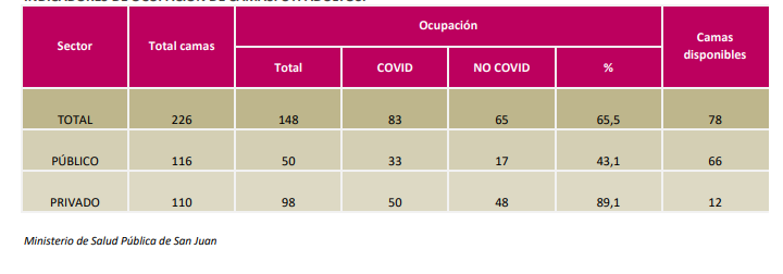 Además, en el sector público hay 33 camas con pacientes con Covid-19 mientras que los internados con otras enfermedades ocupan 17 plazas, quedando disponibles 66.