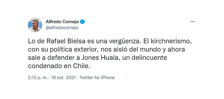 A su turno, el titular de la Unión Cívica Radical (UCR), Alfredo Cornejo, también manifestó su malestar: “Lo de Rafael Bielsa es una vergüenza. El kirchnerismo, con su política exterior, nos aisló del mundo y ahora sale a defender a Jones Huala, un delincuente condenado en Chile”.