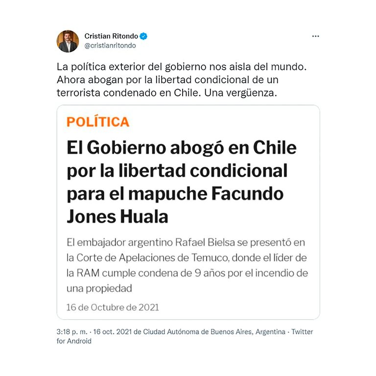 Cristian Ritondo, titular del bloque PRO en la Cámara de Diputados, expresó: “La política exterior del gobierno nos aísla del mundo. Ahora abogan por la libertad condicional de un terrorista condenado en Chile. Una vergüenza”.