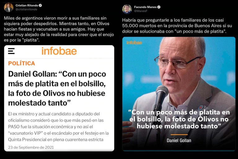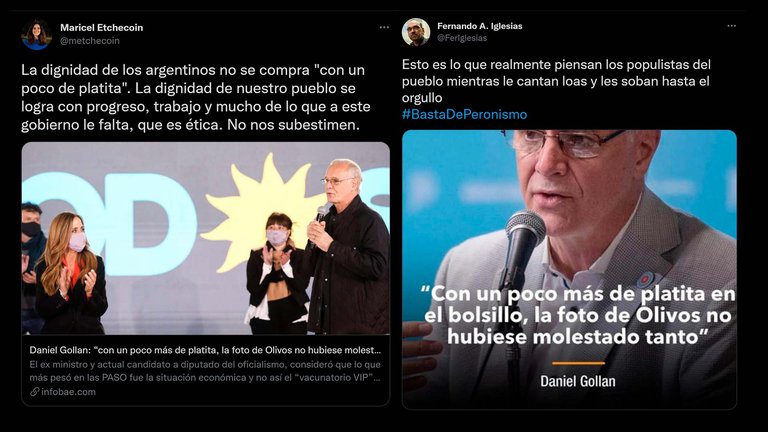 En tanto, Gisela Scaglia, legisladora nacional de Santa Fe, también se pronunció: “Con un poco más de platita en el bolsillo, la foto de Olivos no hubiese molestado tanto, dice Gollan y subestima a los argentinos. Nos encerraron y quitaron la posibilidad de trabajar mientras estaban de fiesta. La inmoralidad no se resuelve con dinero”.