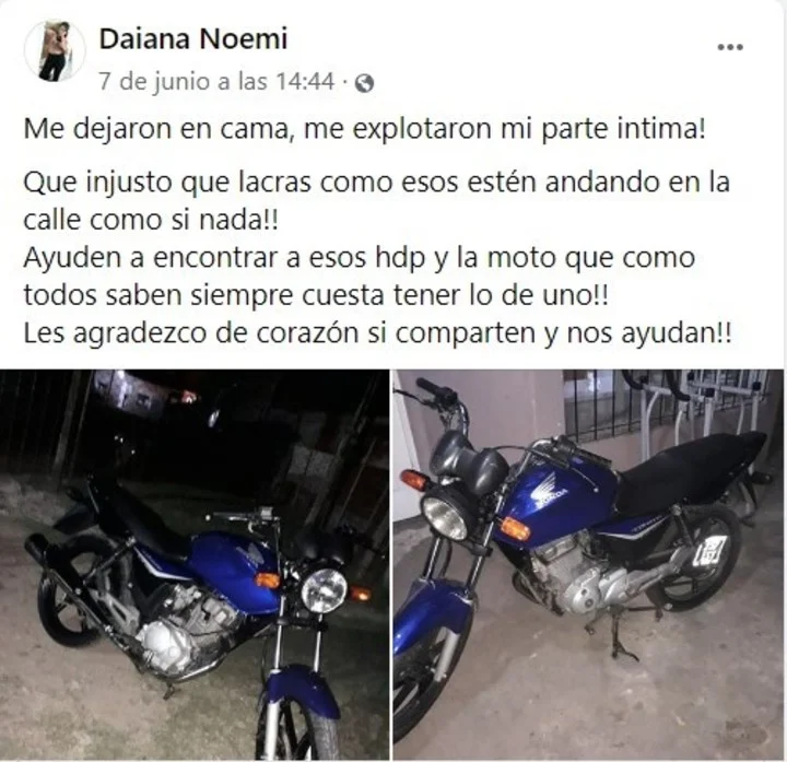 "Me dejaron en cama, me explotaron mi parte íntima. Qué injusto que lacras como esos estén andando en la calle como si nada!! Ayuden a encontrar a esos hdp y la moto, que como todos saben siempre cuesta tener lo de uno! Les agradezco de corazón si comparten y nos ayudan!!", escribió Daiana en su Facebook el día del robo.