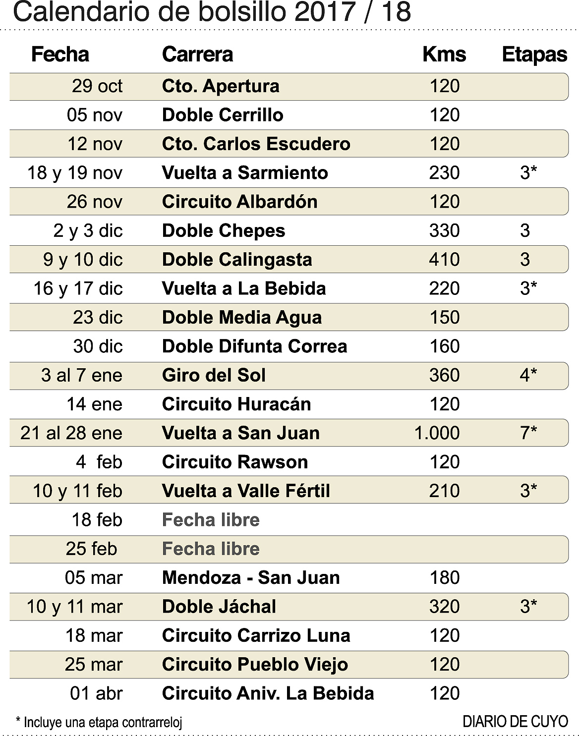 A la exigencia máxima, por jerarquía internacional (la Vuelta), los equipos continentales sanjuaninos llegarán con 1.570 kilómetros de traqueteo, incluyendo en esa primera mitad del calendario a las clásicas Doble Calingasta, Doble Media Agua y Difunta Correa. Además de la Doble Chepes y del Giro del Sol.