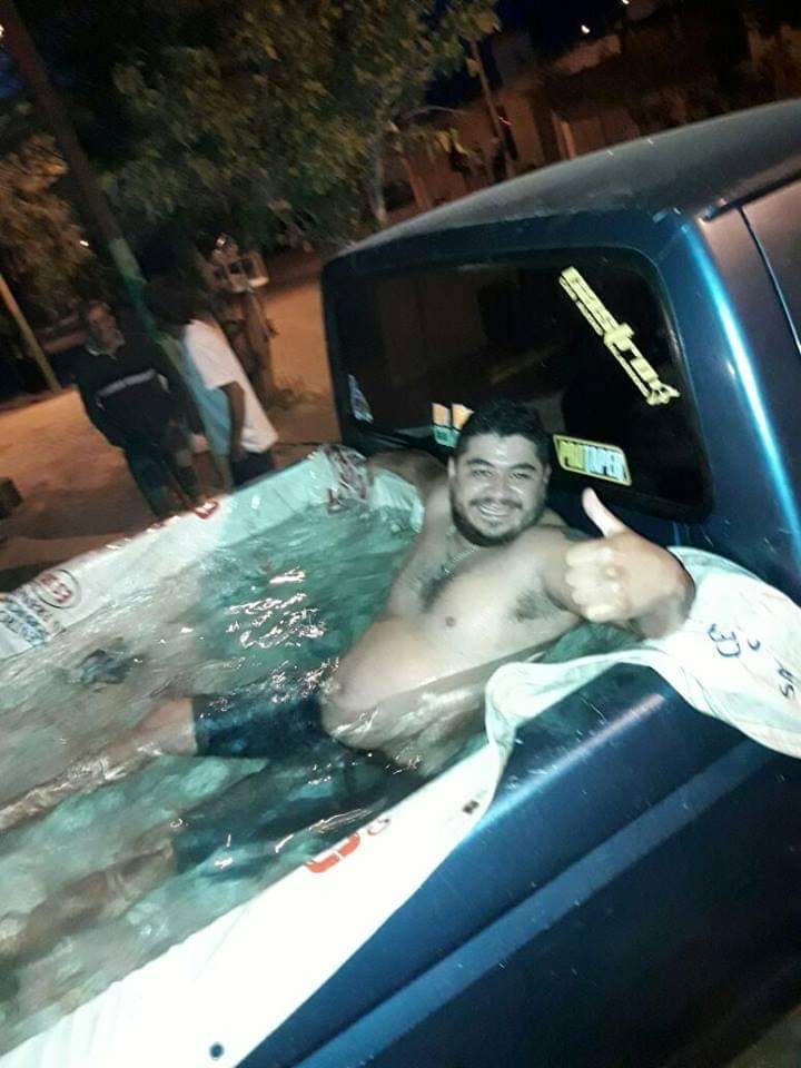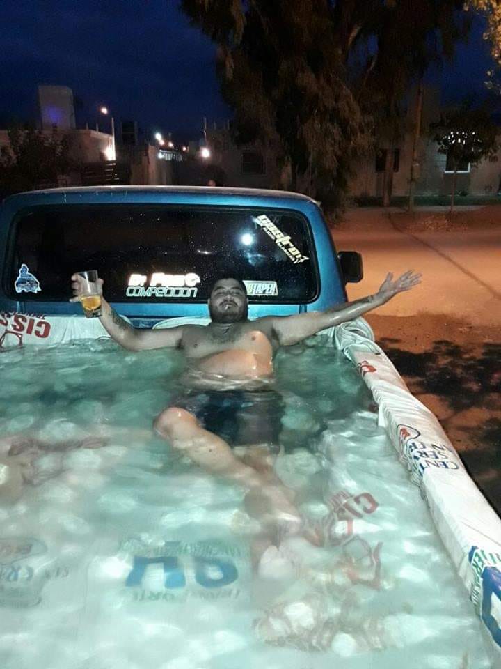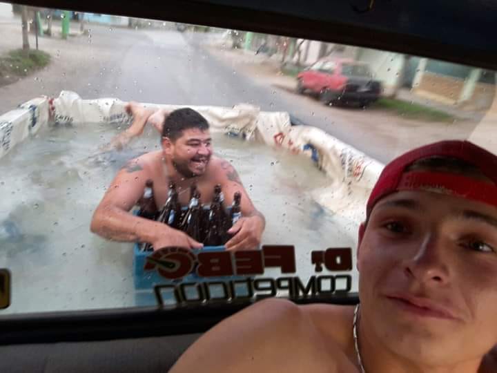 La postal no pasó desapercibida entre los vecinos. El más entusiasmado con disfrutar de los placeres de tamaño invento popular fue Antono ‘El Gordo Toni’ Elizondo, que además de agua le puso algunos hielos para refrescar el agua y no faltaron algunas cervezas. Pero no fue el único cómplice de este invento bien argento.
