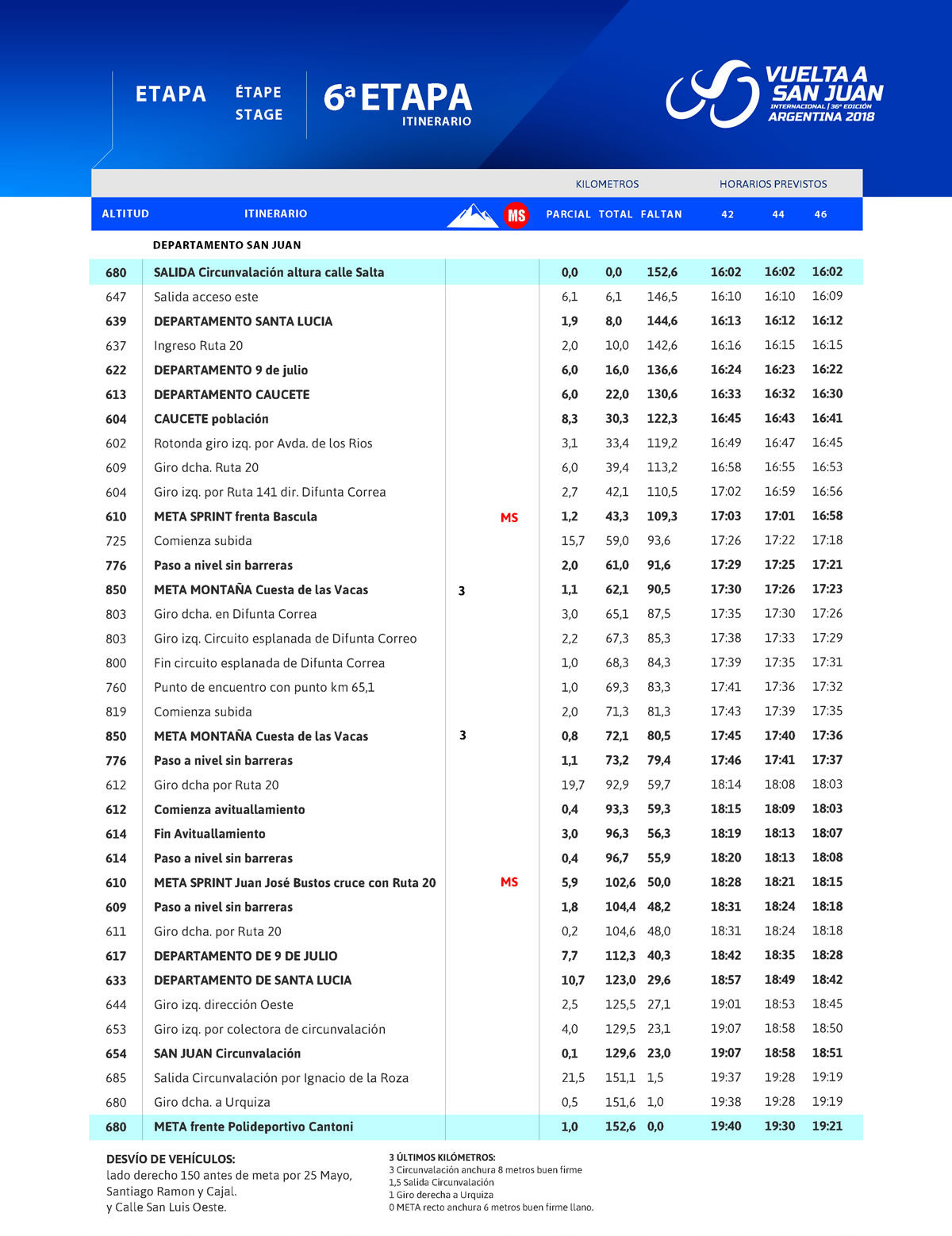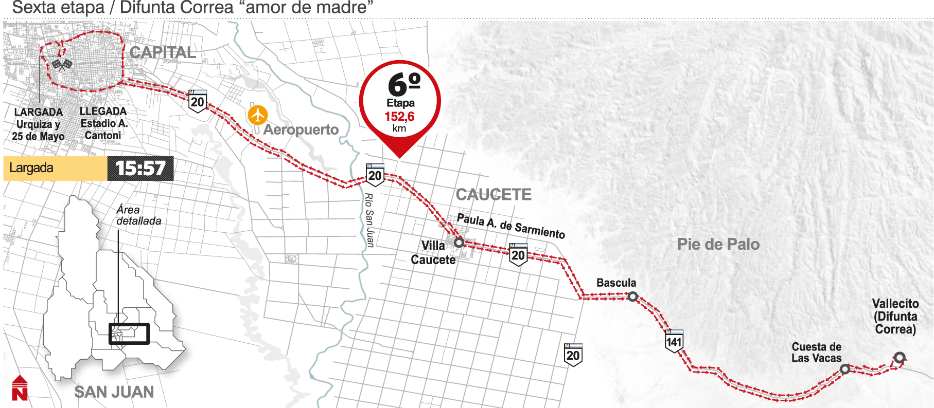 Será una etapa con algunas pendientes que tendrá casi 153 kilómetros de recorrido, teniendo en cuenta que los pedaleros partirán desde Capital y pasarán por Santa Lucía, 9 de Julio y Caucete, hasta llegar a la Difunta Correa. Luego, regresarán y finalizarán en las afueras del estadio Aldo Cantoni.
