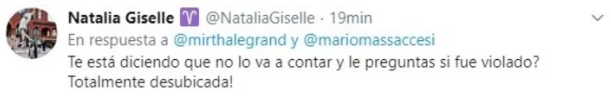"Con qué serenidad Mario respondiste. Es sanación eso… y muy desubicada la señora Mirtha Legrand", "¡Otra vez Mirtha! Esta vez me hiciste enojar mucho. Mario Massaccesi todo un señor", "Te está diciendo que no lo va a contar ¿y le preguntás si fue violado? ¡Totalmente desubicada!", fueron algunos de los mensajes.