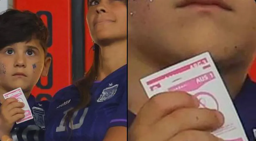 En la fotografía se aprecia a Antonela, con la camiseta suplente puesta, y sosteniendo al pequeño Ciro, quien en sus manos porta dos figuritas del Mundial. Lo curioso es que en una de ellas se ve “Arg 3″ y en la otra se ve “Aus 1″, algo que muchos consideraron como una premonición del resultado de este sábado.