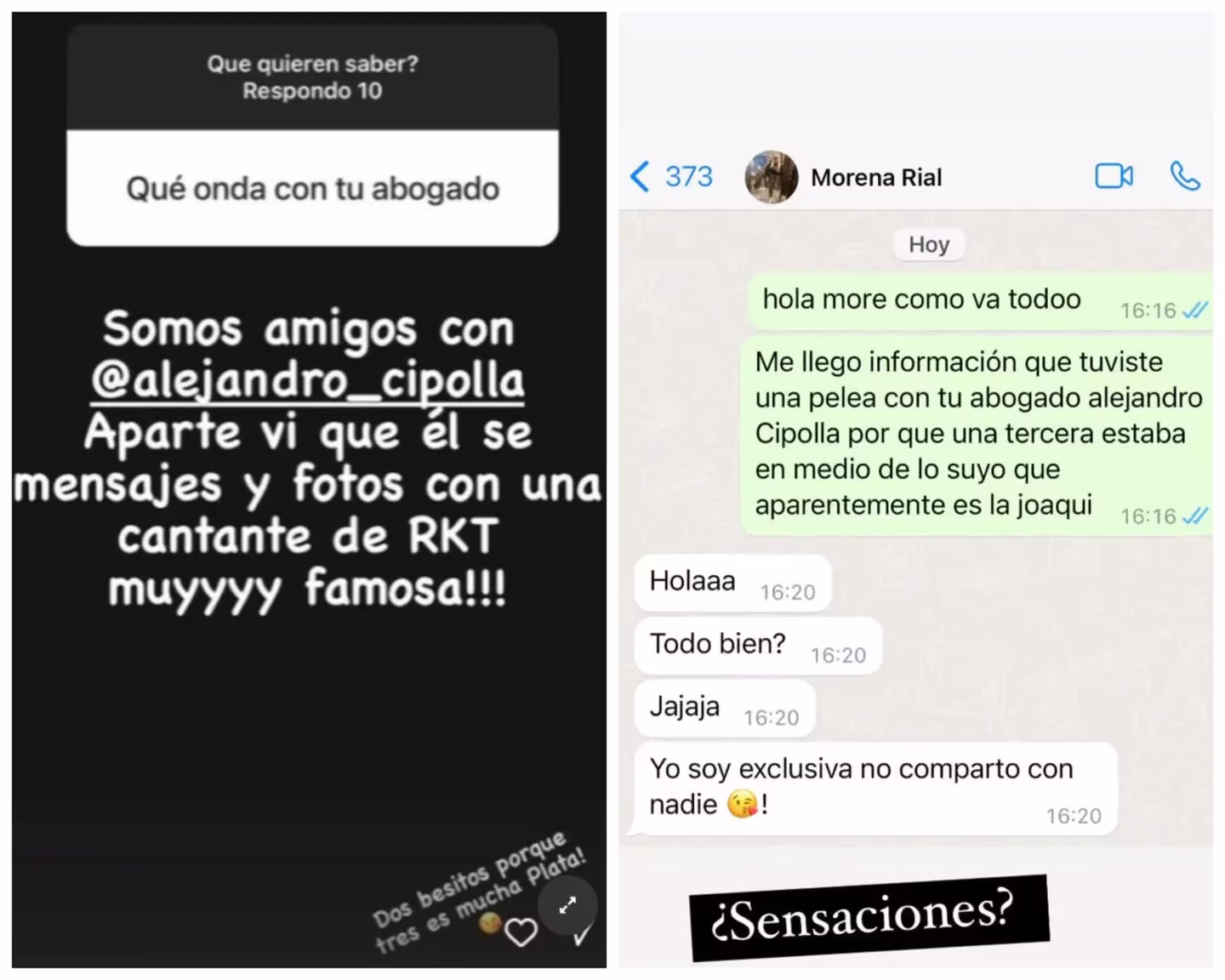 En su perfil de Instagram, el periodista Juan Etchegoyen publicó una captura de pantalla donde aparece la consulta que le hizo en torno al tema: “Hola More, ¿Cómo va todo? Me llegó información que tuviste una pelea con tu abogado Alejandro Cipolla porque una tercera estaba en medio de lo suyo, que aparentemente es la Joaqui”. La ex de Facundo Ambrosioni, respondió entre risas: “Yo soy exclusiva, no comparto con nadie”.