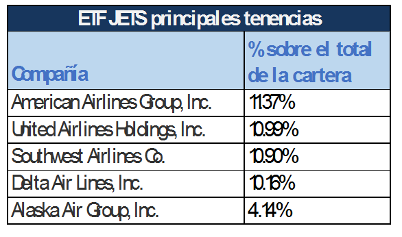 JETS es un etf que invierte en aerolíneas y proveedoras de servicios aeroportuarios a nivel global, con fuerte foco en compañías estadounidenses siendo el top 5 de empresas de este instrumento el siguiente: