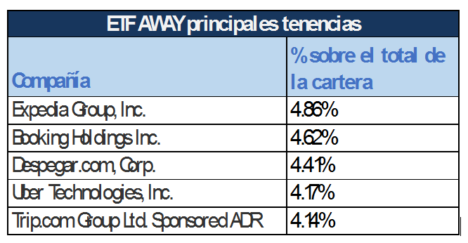 En cuanto al etf AWAY, se focalizan en invertir en compañías que proveen servicios y tecnología a la industria turística, encontrando en el top 5 de su cartera nombres como:
